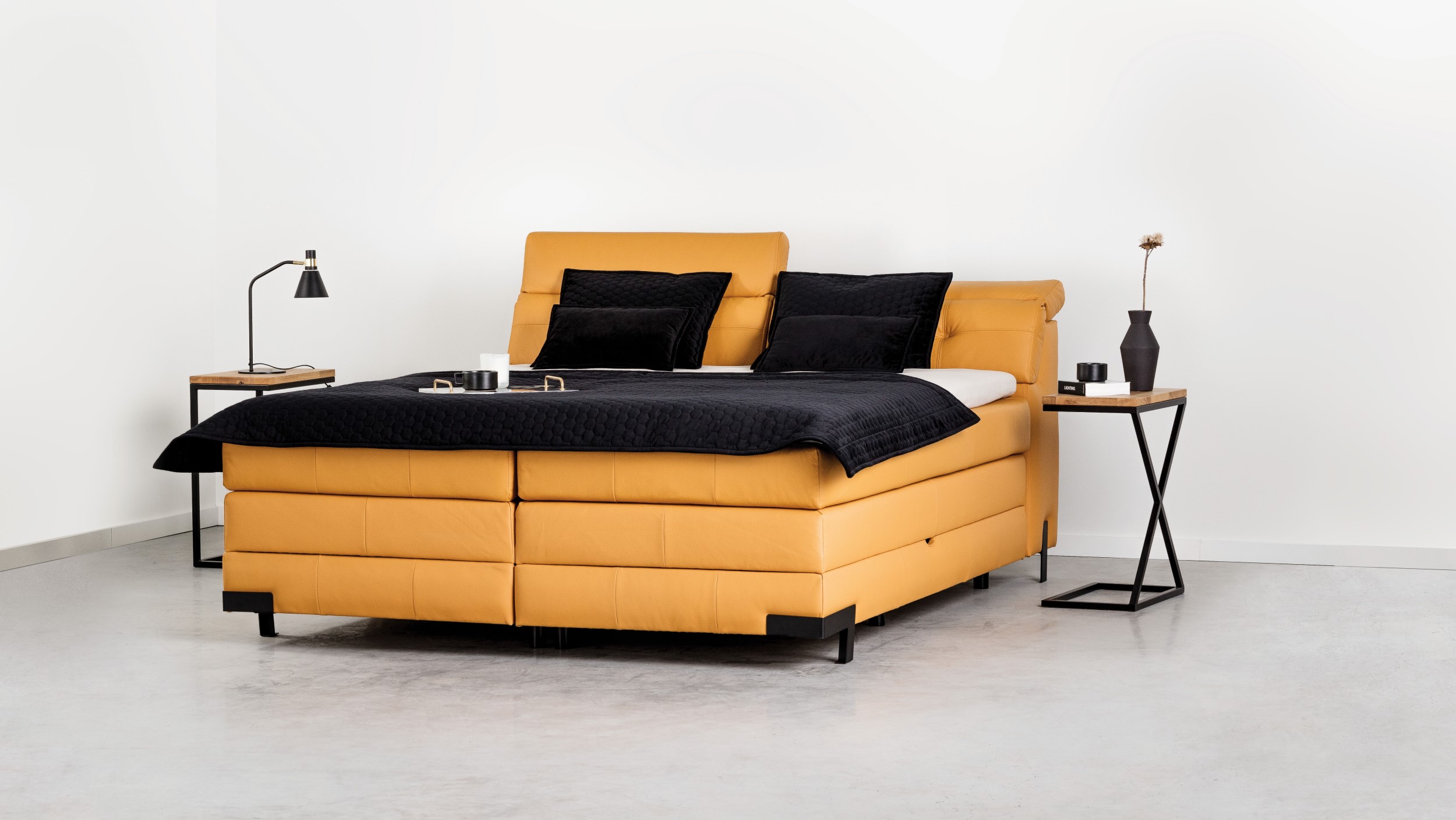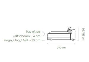 A bed with an interesting headboard consisting of adjustable headrests, making the semi-reclining position a matter of individual preference for the user. Two, large bedding containers provide extra storage space. Decorative metal legs are a distinctive element of this model, setting it apart from the others.